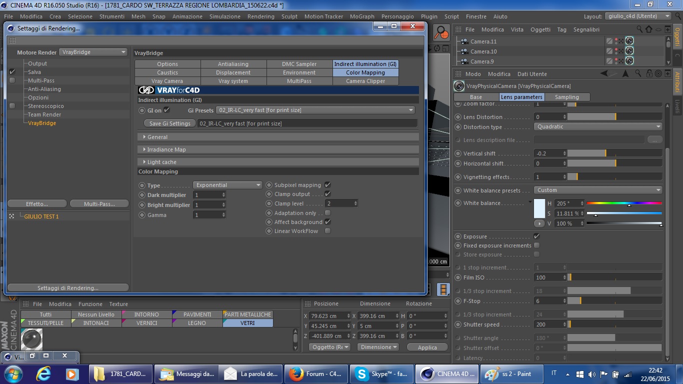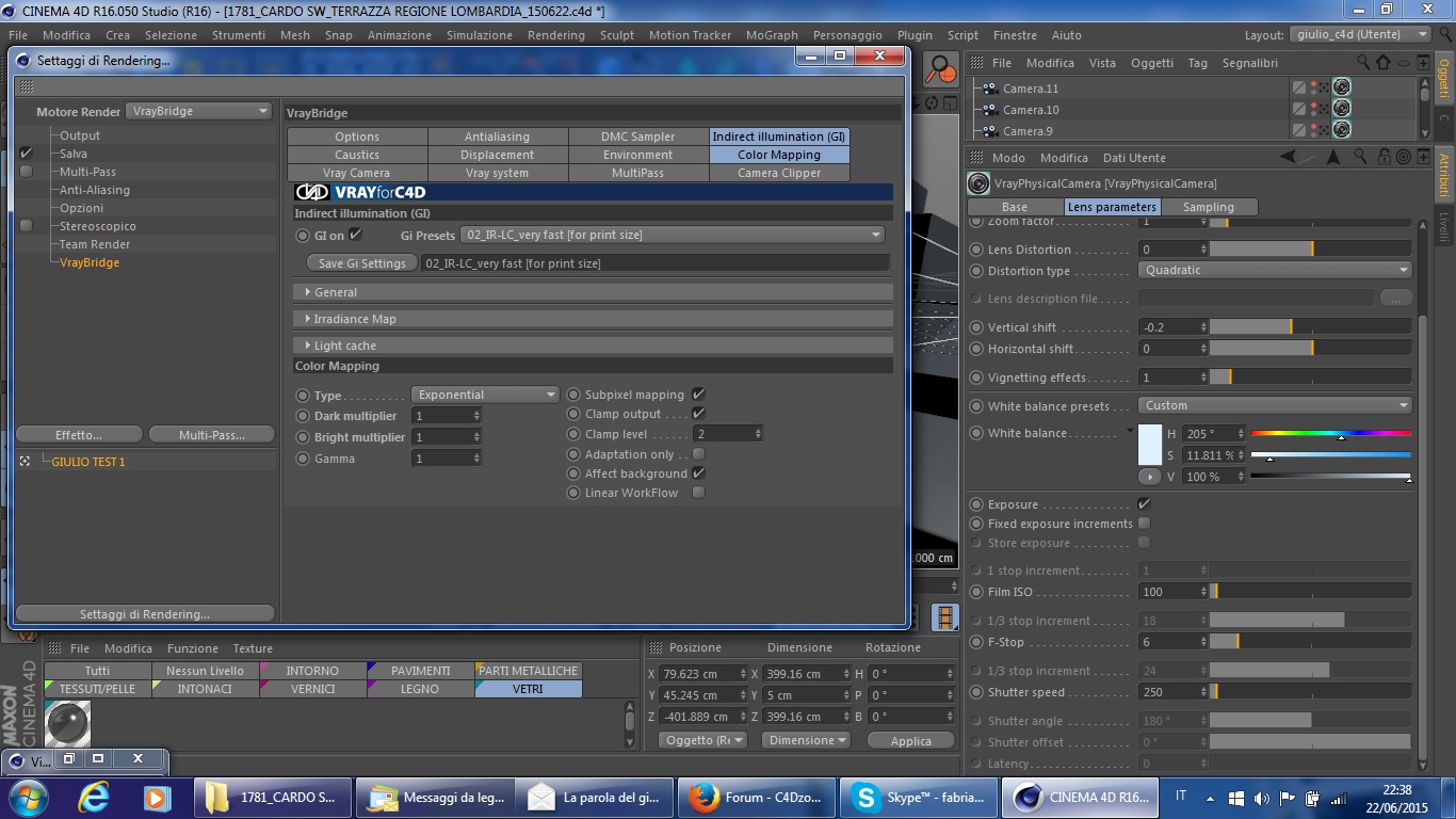 Vi allego uno screenshot per illustrarvi il mio punto di partenza : ho usato sia la guida di c4d (il capitolo 9) che la videopillola sull'illuminazione da esterni per quanto riguarda le impostazioni del vray bridge e per i materiali finora inseriti.