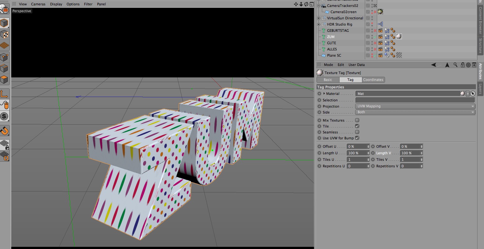 ho creato un MoText che rimbalza su un piano fino a fermarsi. Quindi ho texturizzato il Text con un semplce Mat cui ho caricato in Color una texture a Pois (Vedi screen). Tuttavia non riesco a trovare il modo di texturizzare bene su tutti i lati delle lettere, pur muovendo i vai Lenggth U, V... se tiri uno si stira l'altro... Ho provato anche a cambiare le Projection, ma nulla, la texture "scivola" durante l'animazione e quindi nulla. Devo rimanere sulla UVW, ma come posso texturizzare bene? :o