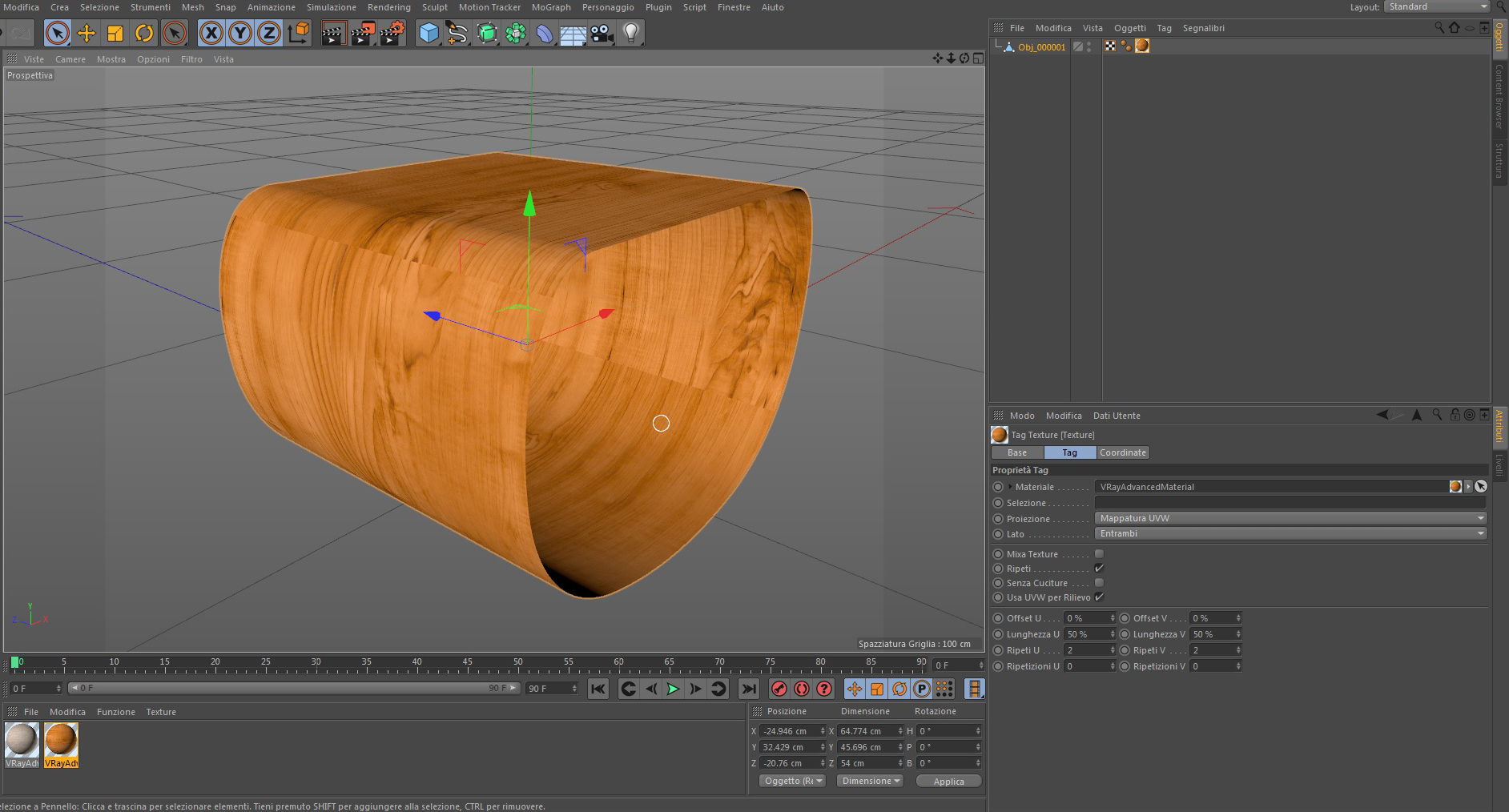 62VAMPIRO ha scritto:Se non alleghi le/la texture è impossibile utilizzare il tuo file e quindi è impossibile capire cosa c'è che non và. Dovrebbe essere un problema di proiezione: prova a cambiarla in Cubic, Flat ecc...ecc....poichè i materiali Vray hanno proiezione Sferica di default. Poi prova anche selezionare il tag del materiale>>tasto dx>>Fit to object............