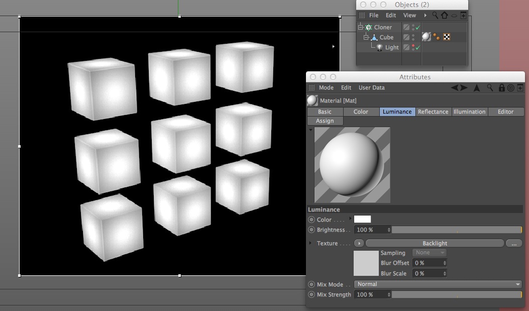 Oggi ho perso parecchio tempo a far funzionare un cubo con materiale subsurface clonato in n cloni con in gerarchia un pccola luce che creasse la traslucenza che volevo, ma non c'è stato niente da fare. Pur ottenedo la traslucenza nel modello, appena clonavo diventava decisamente più piatto come se non funzionasse la luce