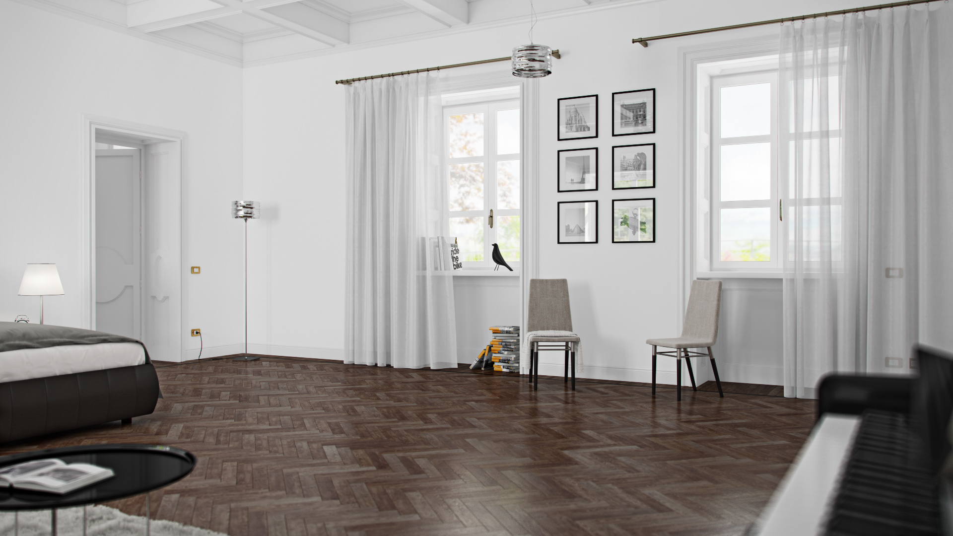 Visivamente troppo bianco, probabilmente un bianco troppo puro, gli infissi sembra siano stati tinteggiati con la stessa pittura bianca delle pareti, non bella la AO nel soffitto a cassettoni (anch'esso troppo bianco, stessa pittura)