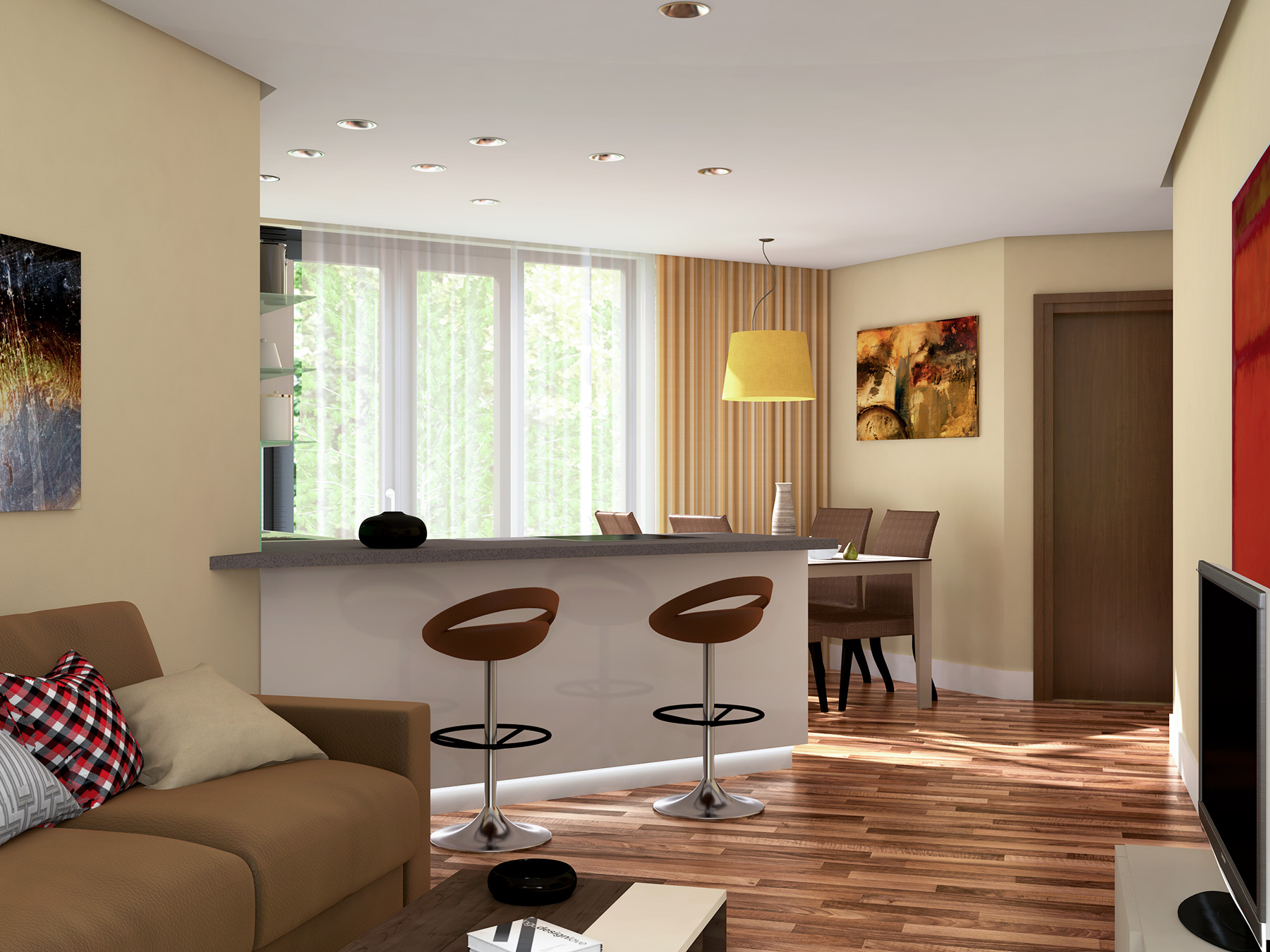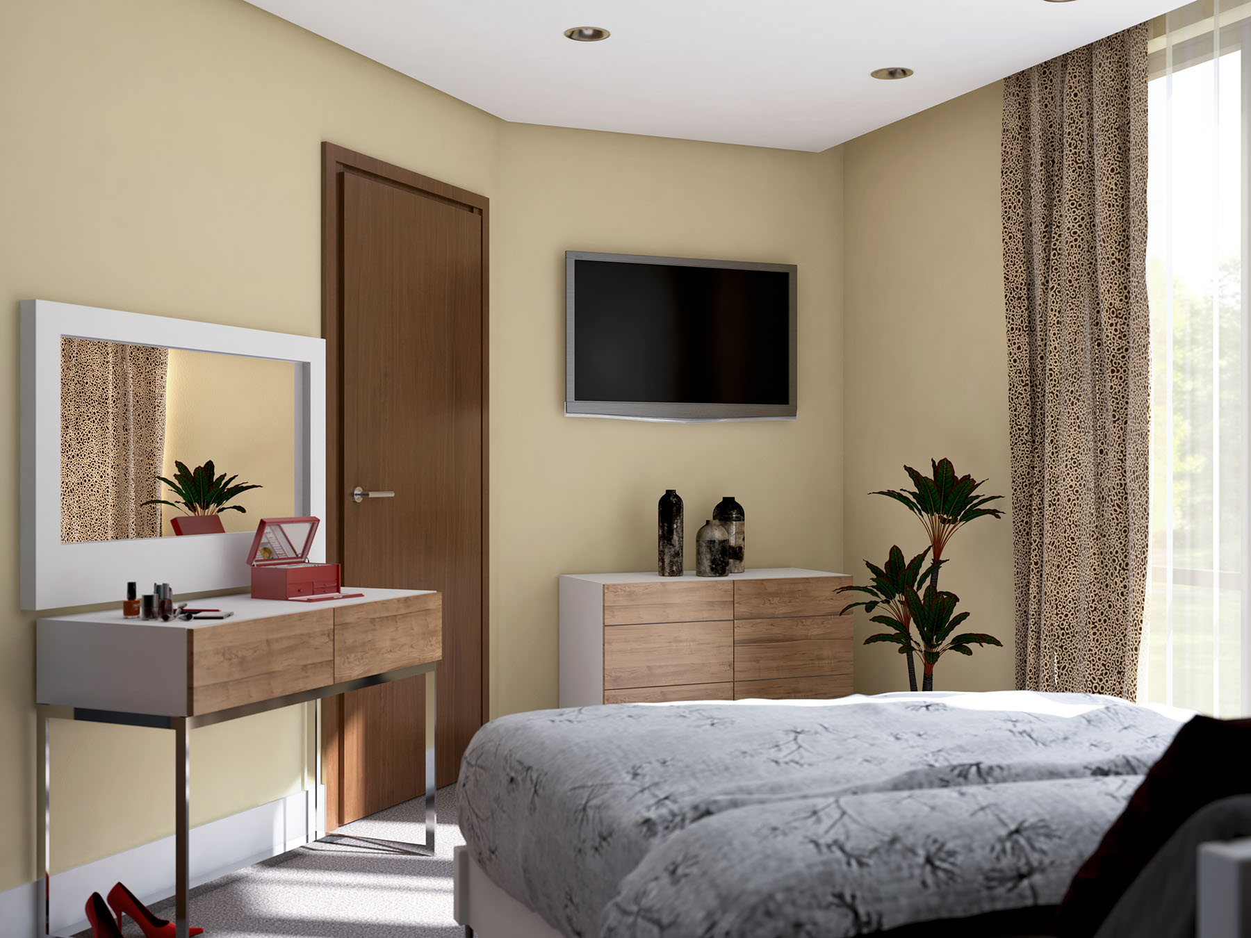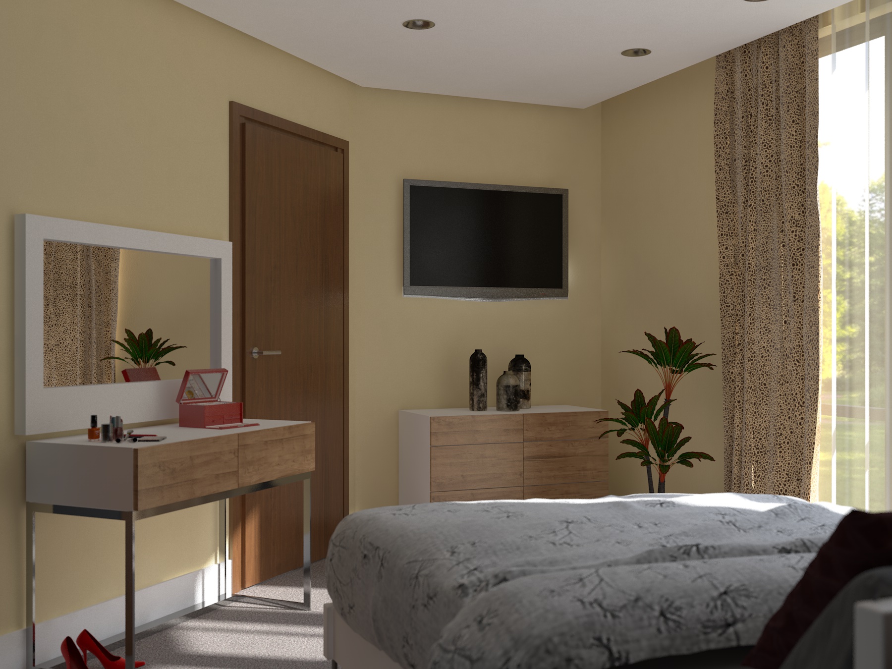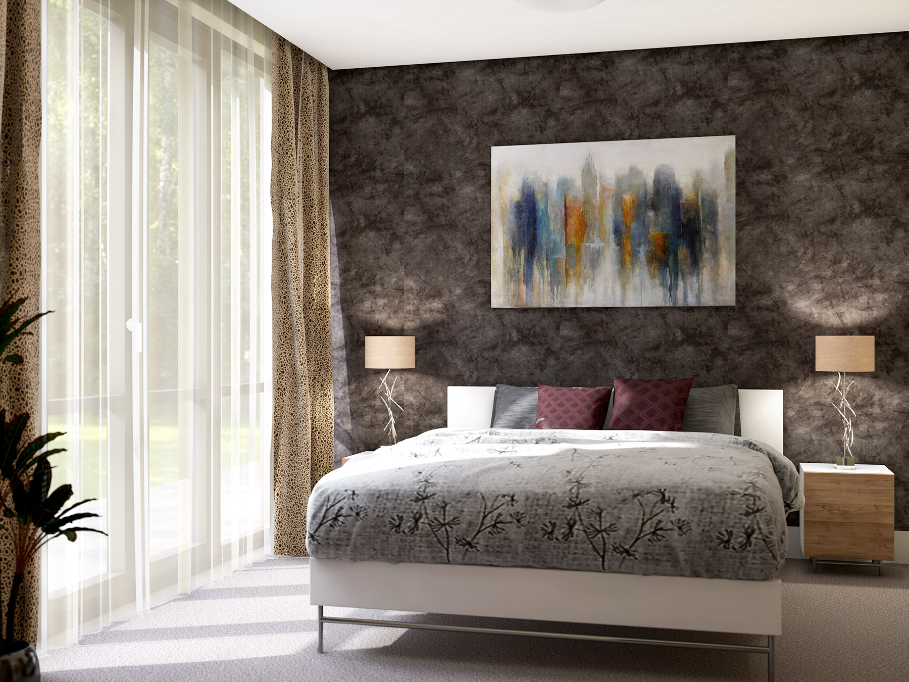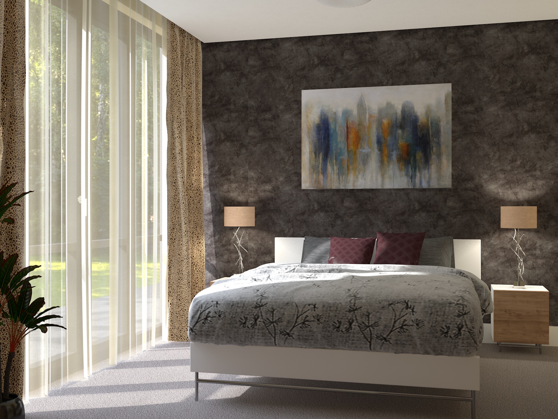 Sul muro di fronte c’è carta da parati, quindi un po' di tiling ci sta. Il grigio sul pavimento dovrebbe essere una moquette. Si capisce un po' di più nella versione definitiva che sto terminando adesso (il lavoro va consegnato domani). Purtroppo in questo lavoro ( 4 appartamenti )ho le mani legate sia quanto riguarda i materiali (li sceglie il cliente su internet generalmente con una qualità bassa), sia i mobili.