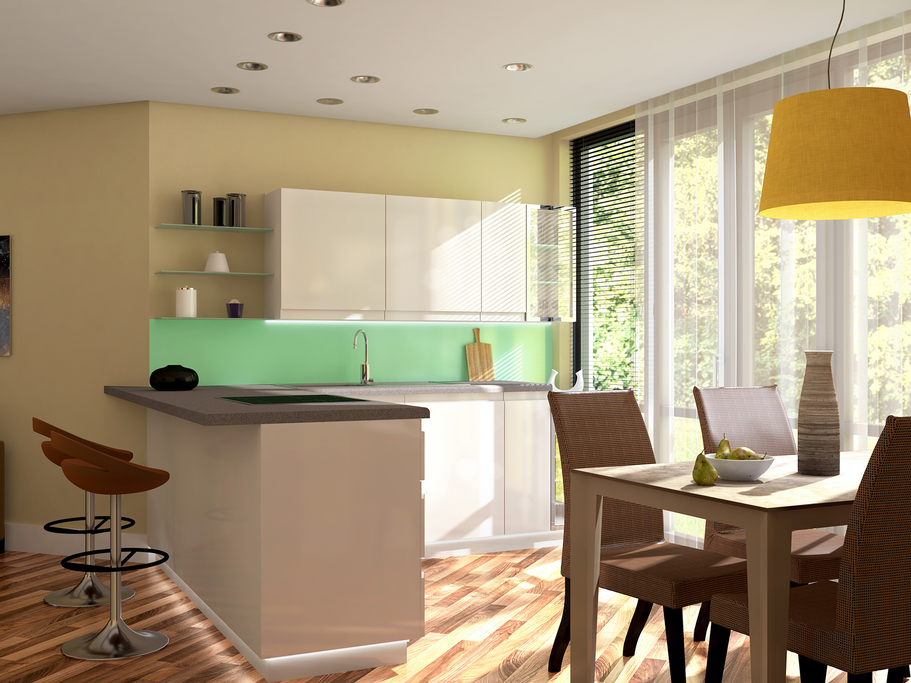 Capisco le esigenze del cliente se vuole vedere le luci artificiali accese, a questo punto io illuminerei dall'esterno solo con cielo (senza sole) in modo che le luci interne stacchino maggiormente e non si perdano con la luce solare forte