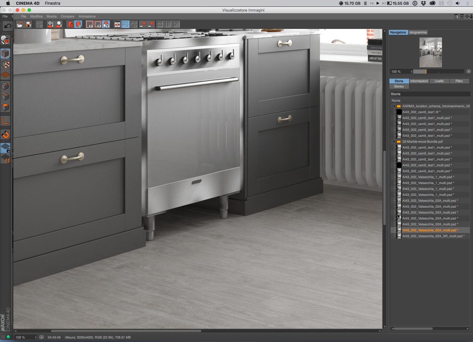 C4D finora l'ho usato al 90% per altri tipi di lavori, ad esempio progetti di espositori, box e sale mostra, sempre per le ceramiche, lavori più tecnici che non hanno mai richiesto il fotorealismo. Anni fa ho acquistato Vray ma in pratica l'ho usato per un solo lavoro, render di macchine industriali, mai per ambienti. Per diversi motivi: con la versione 1.2.6 era quasi impossibile ottenere precise maschere di scontorno (oggi buffer) che sono assolutamente necessarie per gli ambienti ceramici, e anche i materiali che inserivo non erano per niente simili agli originali, così ho smesso. Con la 1.8 è stato aggiunto il Multipass, benissimo, ma per creare un ambiente ex-novo ci voleva troppo tempo, e i clienti vogliono spendere poco. Inoltre avevo sempre il problema dei materiali, che risultavano troppo diversi da quelli veri. Smesso di nuovo.