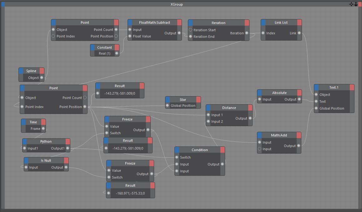 Con il nodo Python ( per semplicità) stabilisco se il frame è pari o dispari, quindi, congelo alternativamente il vettore di posizione con i due nodi freeze ( ottengo così la posizione precedente frame per frame ) che poi inverto passandola al nodo distance per calcolare la distanza tra vettori attuali e precedenti e quindi la velocità immediata ( c'è differenza tra velocità media e velocità attuale o su brevissime distanze, se ci pensiamo, la velocità in un dato momento, è sempre pari a zero).