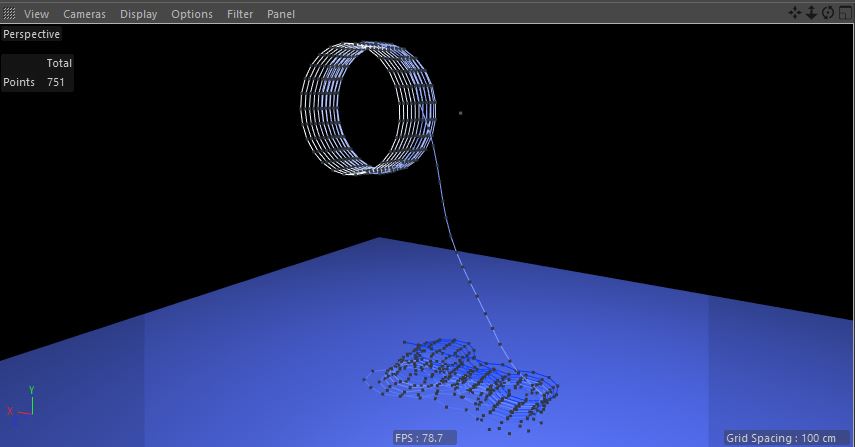 Per iniziare, con una spline, spingendo un po sulle iterazioni, sulle suddivisioni e soprattutto sugli steps, si ottiene un buon risultato anche ad elevate velocità di rotazione. Il vero insormontabile problema però, è chiaramente l'interazione con se stessa e cioè lo spessore; a dirla tutta anche che la spline ( i suoi punti) deve "fermarsi" una volta raggiunto la posizione finale, cioè smettere di essere dinamica ed "appiccicarsi al gomito seguendone il movimento. questo sia per diminuire i calcoli a quel punto non più necessari, sia per stabilire una "forma" all'avvolgimento senza che "il filo" scivoli dalla superficie rendendo vana la rotazione.