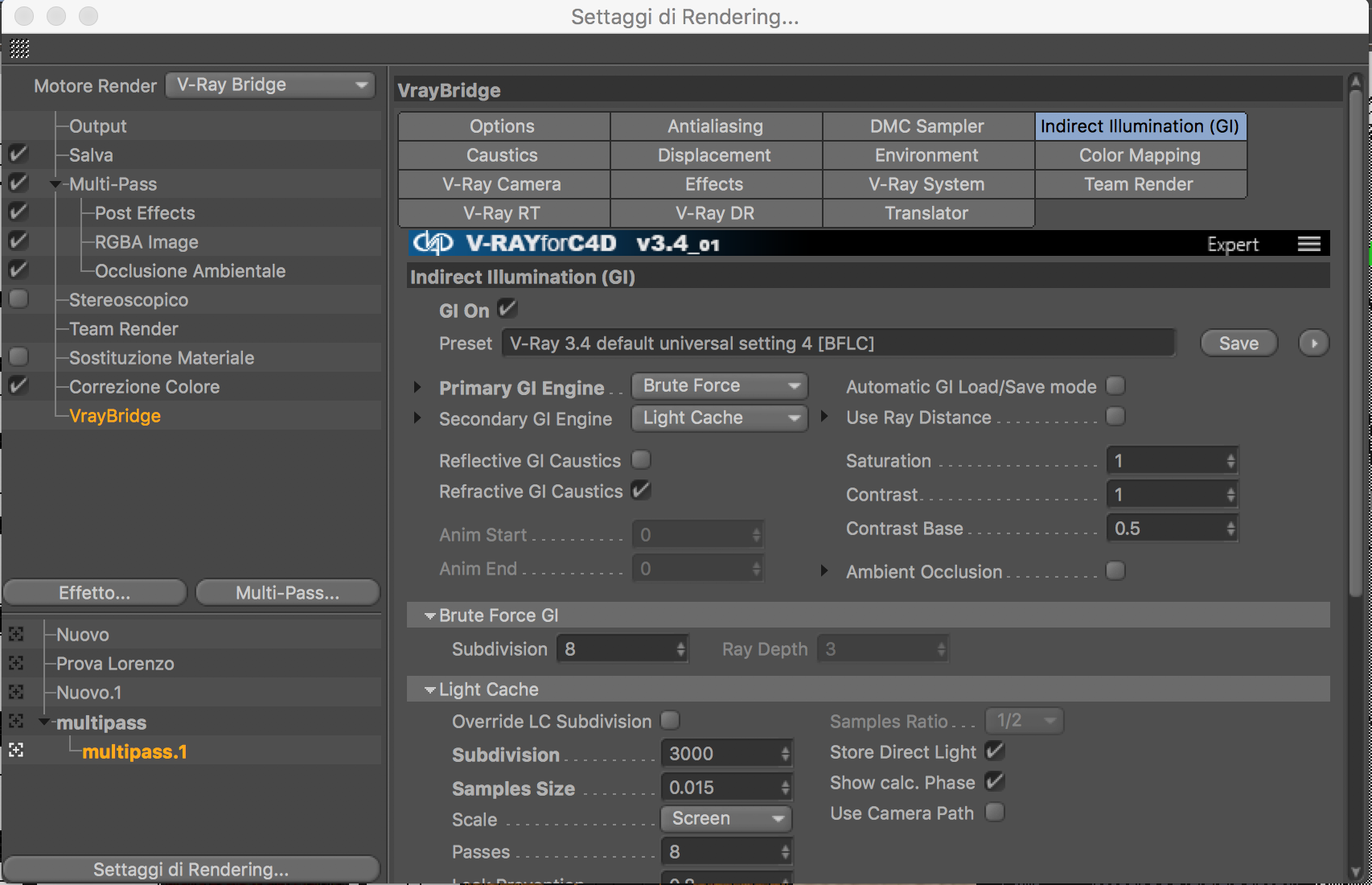 Tu invece hai usato una tecnologia basata sempre sulla prima tecnologia la Light Cache (LC) ma come altro passaggio hai usato il BR, che si chiama Brute Force. Quella tecnologia e' un sistema usato in animazione per evitare il flickering ovvero lo scoppiettio proprio dell'altra tecnologia (Irradiance Map) e quindi hai usato una tecnologia ottima ma estremamente lenta e può' in alcuni casi manifestarsi la polvere perché lavora con il disturbo invece delle macchiazze in giro, quindi al massimo trovi del noise nell'immagine.