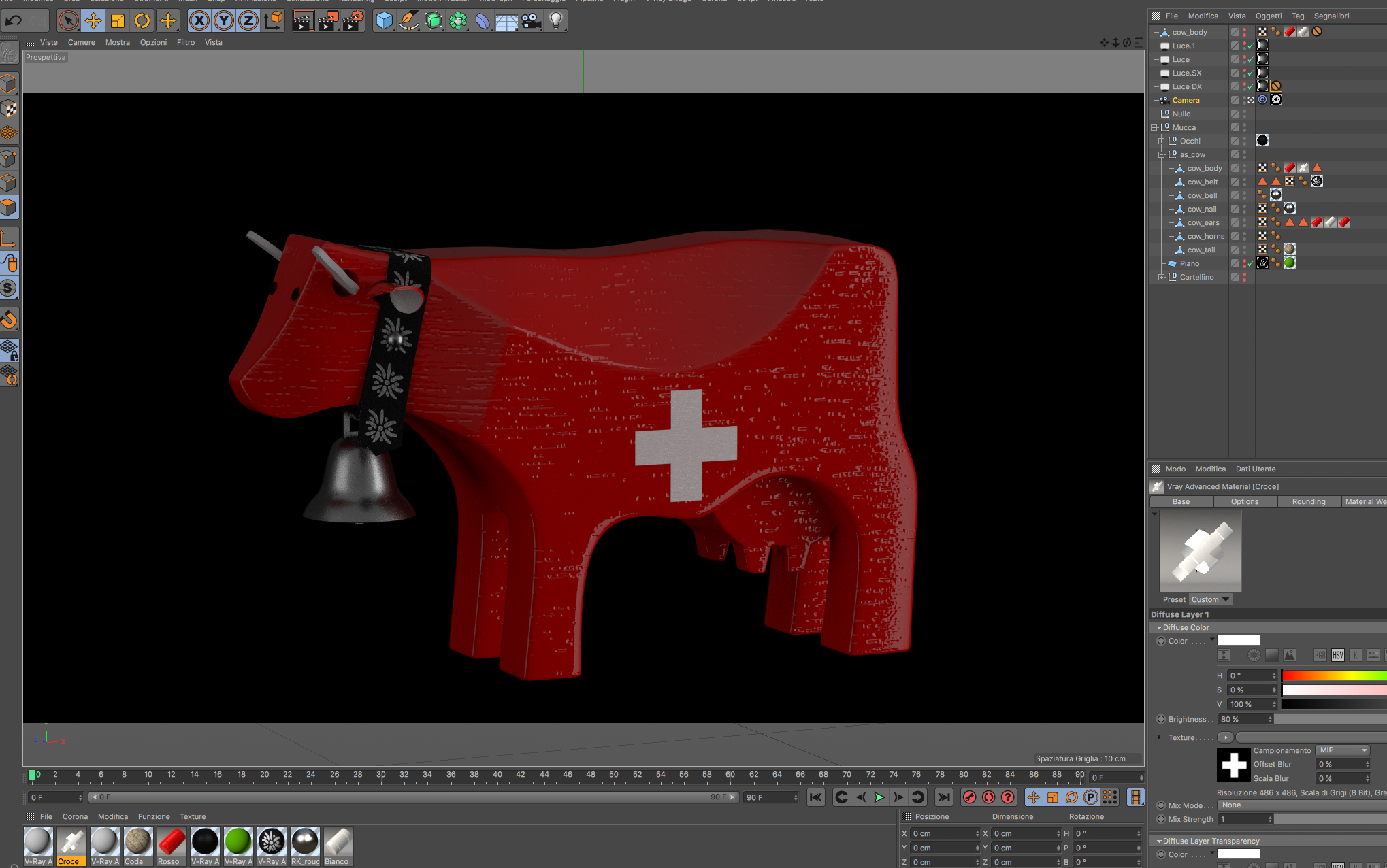 Buongiorno, ho renderizzato una mucca in legno verniciata di rosso e devo inserire una croce bianca (come montaggio fatto in photoshop allegato) che mantenga le stesse venature del materiale rosso realizzate con il canale bump. Non sono molto pratico e non riesco a trovare la strada ottimale per farlo. Qualcuno mi potrebbe speigare come farlo? Ho scritto sul forum v-ray in quanto il rendering è stato fatto utilizzando v.ray e i suoi materiali.