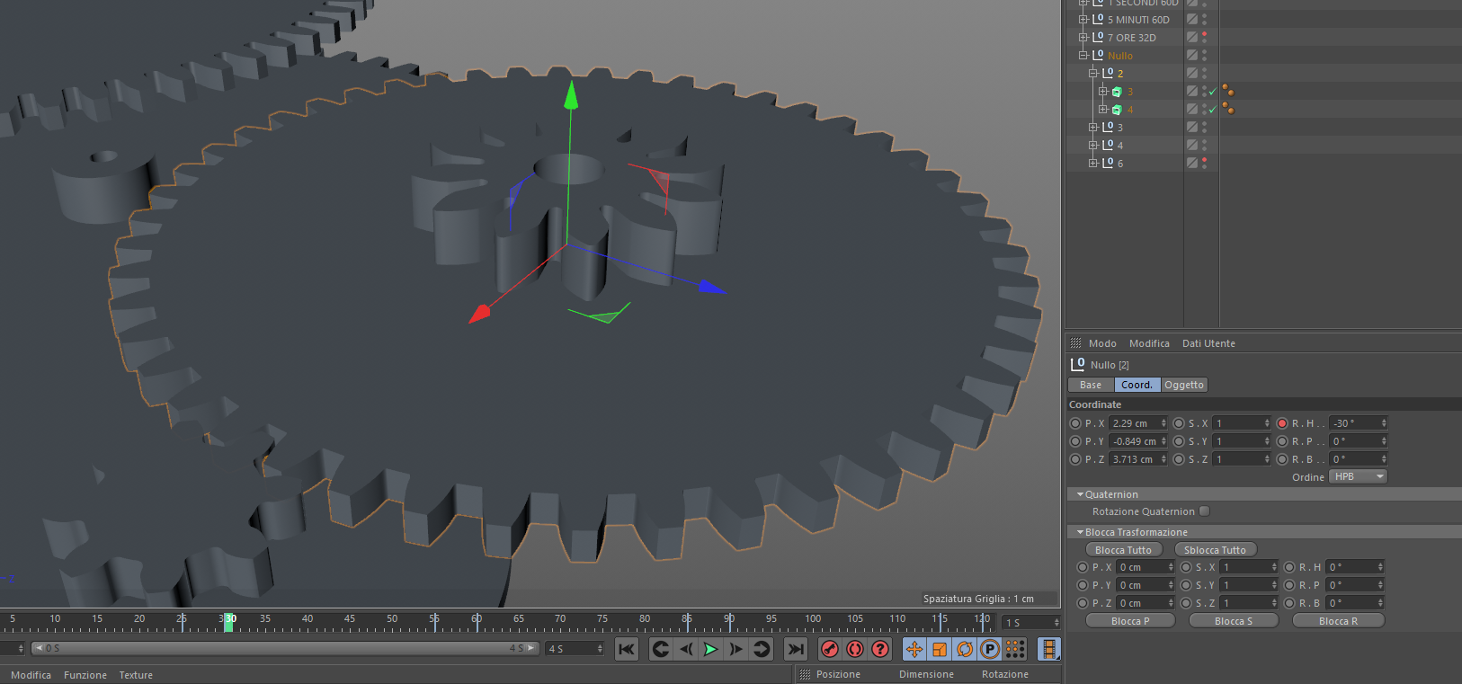 ho un oggetto nullo a cui applico una rotazione di x gradi ogni tot tempo, per intenderci l'oggetto nullo che nelle immagini si chiama 2, questo a sua volta ha due figli estrusi a cui non è stata applicata nessuna animazione nel tempo, il figlio(quello estruso) chiamato 3 segue correttamente la rotazione del genitore, mentre il 4 no, ho provato a cambiare l'ordine ma non cambia nulla, gli assi sono allineati, non so quale sia il problema.