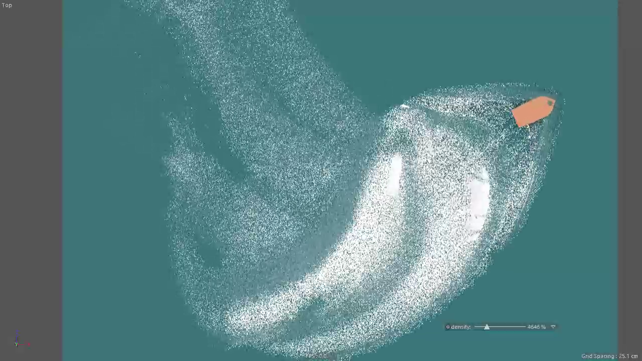 calcolando i dati di propagazione delle onde ( in questo caso estrapolando la direzione dei singoli punti che compongono l'onda sulla mesh) si ottiene un array che forma un campo di forze che ho riapplicato alla mesh per trasformare le onde da trasversali (1D) a trasversali e longitudinali (3D), il che trasla i singoli punti non solo lungo l'asse Y ma anche in Z e X rendendo le onde molto più complesse. Poi mi sono chiesto: cosa succederebbe se aggiungessi una milionata di particelle alle increspature applicando lo stesso campo di forze a creare spray e foam? (...) Al momento solo sperientale le particelle (TP) grazie a python non sono legate ad un emettitore ma vengono generate singolarmente da valori specifici delle onde come forza e altezza...