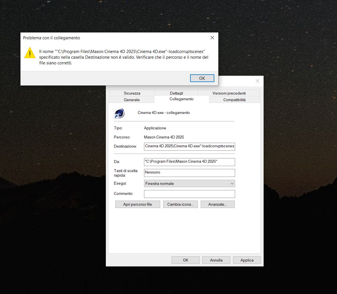 Per aprire i file corrotti di Cinema 4D su Windows, seguite questi passaggi: cliccate con il tasto destro sul collegamento desktop di Cinema 4D --> proprietà - e nella sezione "Destinazione" dopo: "C:\Program Files\Maxon Cinema 4D 2024\Cinema 4D.exe" aggiungete questo: -loadcorruptscenes. Applicate le modifiche e cliccate su OK.