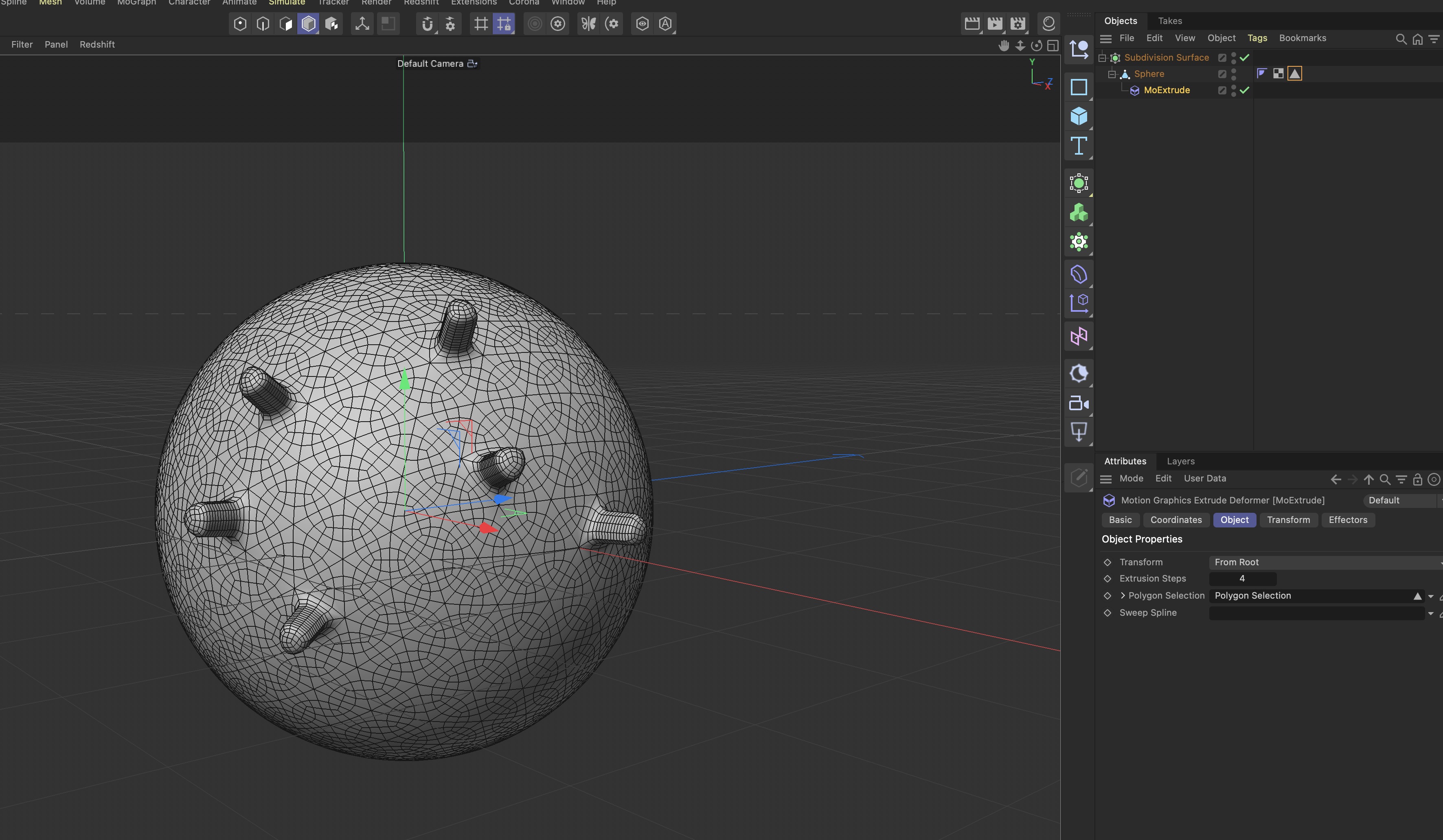 Hi Alohaey, I'm happy you achieve some good results...so...you can work with a single step by manually create an extrusion on the selected poly, but you need to do the same step on other polygons to make more tentacles...with MoExtrude you can make many copies on polygons selection and change value with some effectors...
