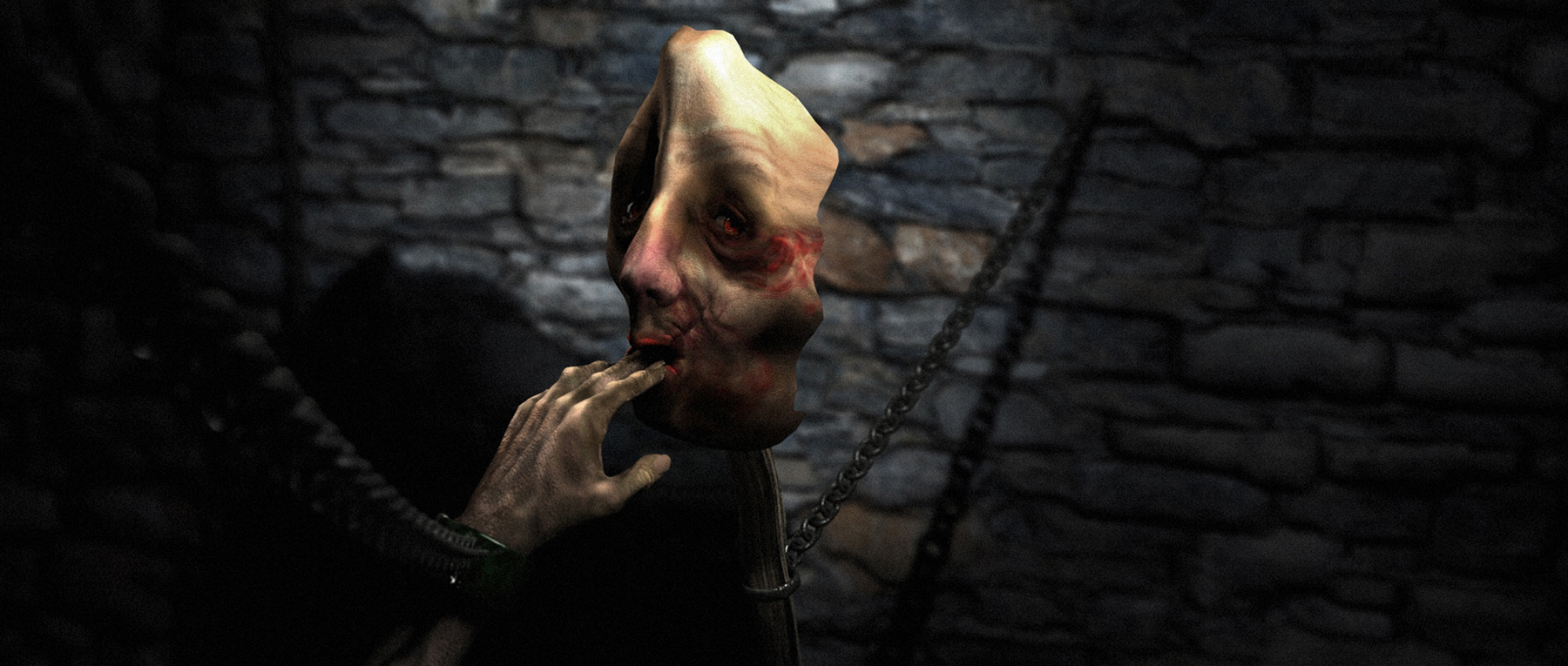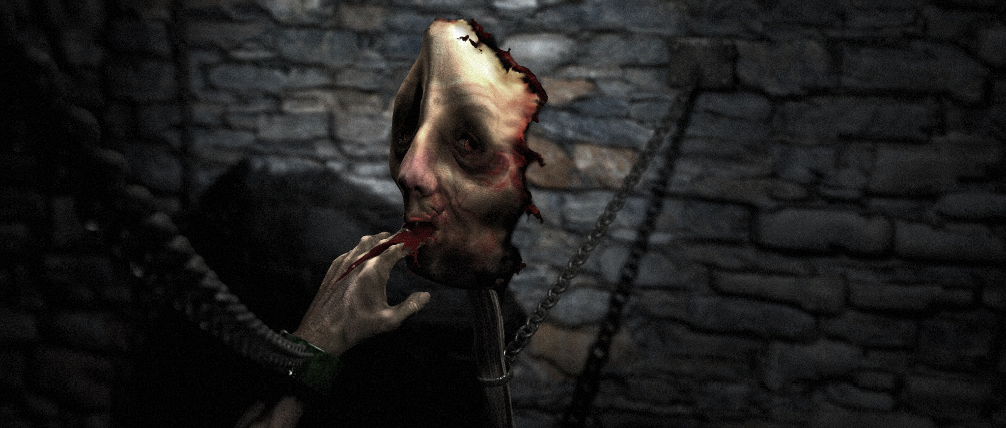 Aggiungo: manca la piastra metallica che attacca la catena del volto alla parete e non sono convintissimo dell'illuminazione, ... continuo a pensare di inserire una fiaccola, delle ragnatele e del sangue che cola sulla mano dalla bocca ...