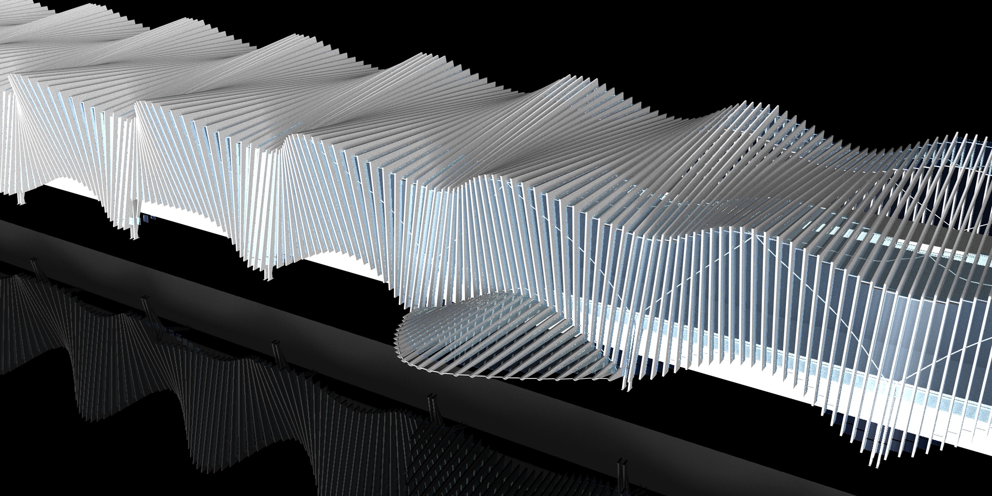 Quello che vorrei fare è un render di questa stazione della TAV di Calatrava realizzata in vetro e acciaio pitturato di bianco. Il risultato finale che vorrei ottenere è quello di una sorta di modellino/plastico su fondo nero lucido. I materiali sono quelli che ho già inserito in quanto è un vincolo del progetto (a meno che ci siano suggerimenti per un migliore effetto dell'acciaio bianco o del vetro con questo colore, però). Io ho pensato anche di mettere un'immagine di un cielo nella texture della riflessione del vetro per dargli maggiore realismo:può funzionare?