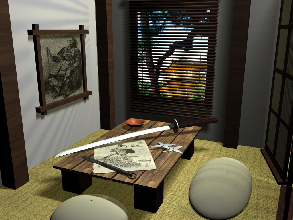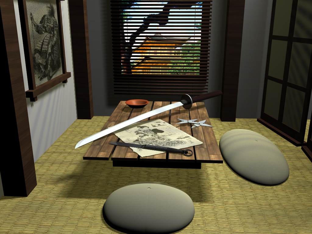 la katana e le stelle le farei un pò più piccole mi sembrano grosse rispetto all'ambientazione e forse anche le sedute.