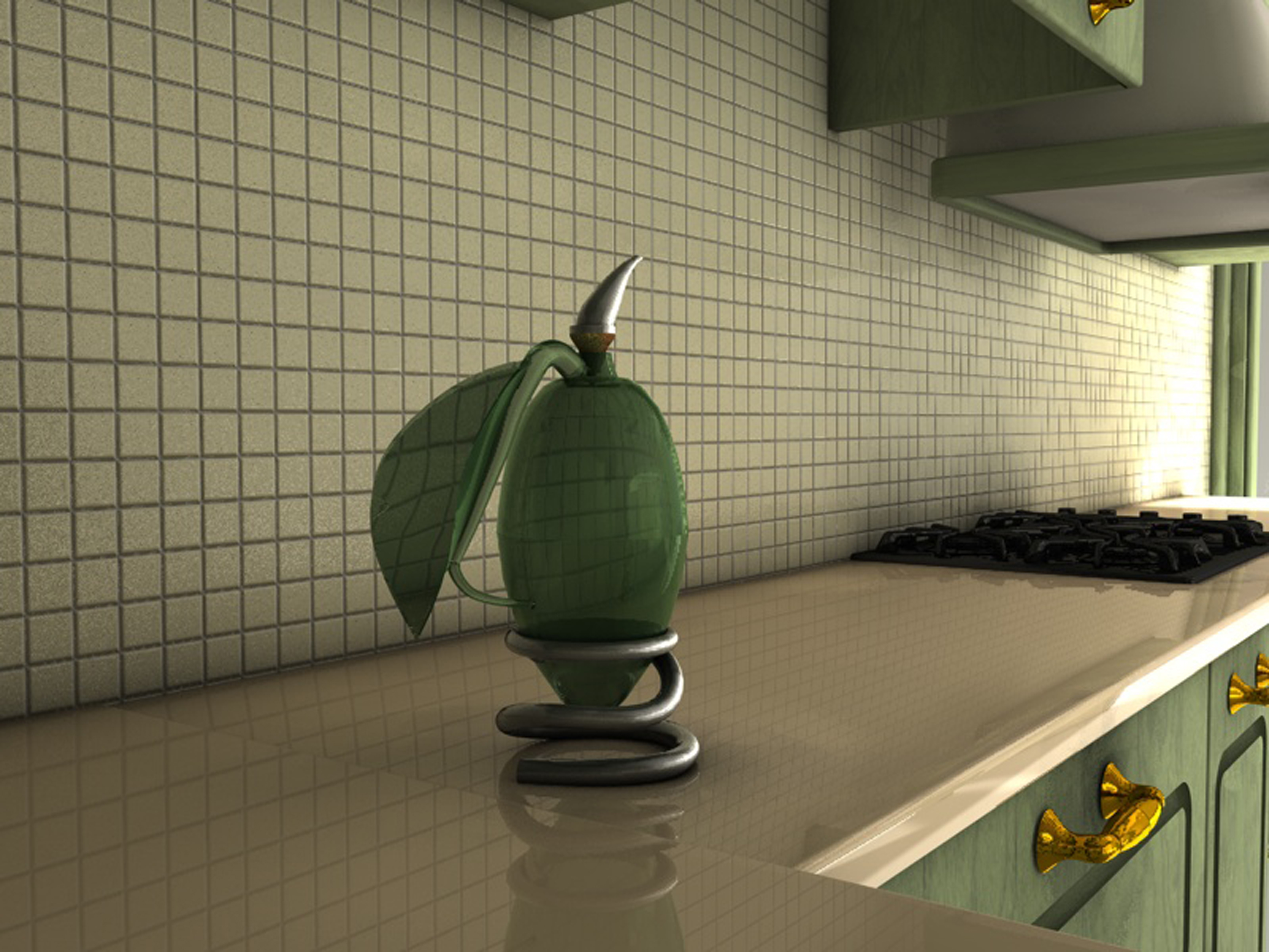 lìidea è molto carina proverei a mettere l'olio all'interno e a rendere la scena un po' più luminosa. Ergonomicamente parlando non riesco a capire se la foglia possa essere usata come manico (mi sembra troppo larga), magari fai qualche altra vista per capire meglio.
