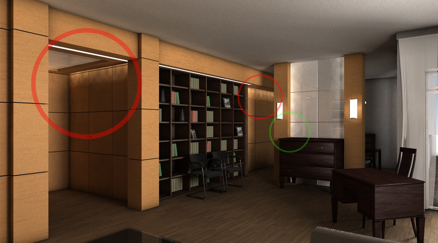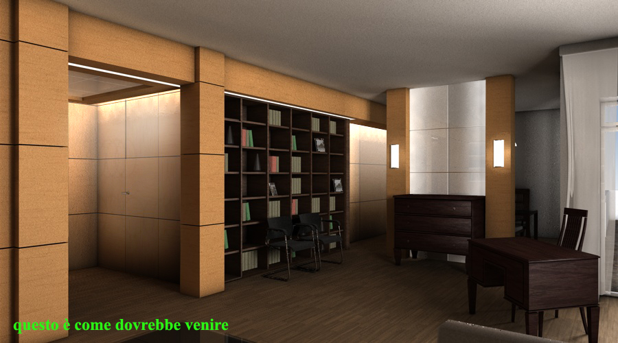 Nei punti cerchiati in rosso dovrei inserire un illuminazione diffusa, proveniente dal'alto, come se ci fossero dei neon per capirci, nel cerchio in verde stessa cosa ma la luce dovrebbe venire da destra e da sinistra e illuminare i lati dei pannelli bianchi.