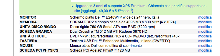 un processore quad core da 22,5 ghz e una scheda grafica dual crossfire tm 512 mb ati radeon 3870 hd, mentre il mac mi offre una NVIDIA GeForce 8800 GT 512MB , io principalmente ho bisogno di un computer per fare rendering più che per lavorare,costa quasi il doppio.... che fare