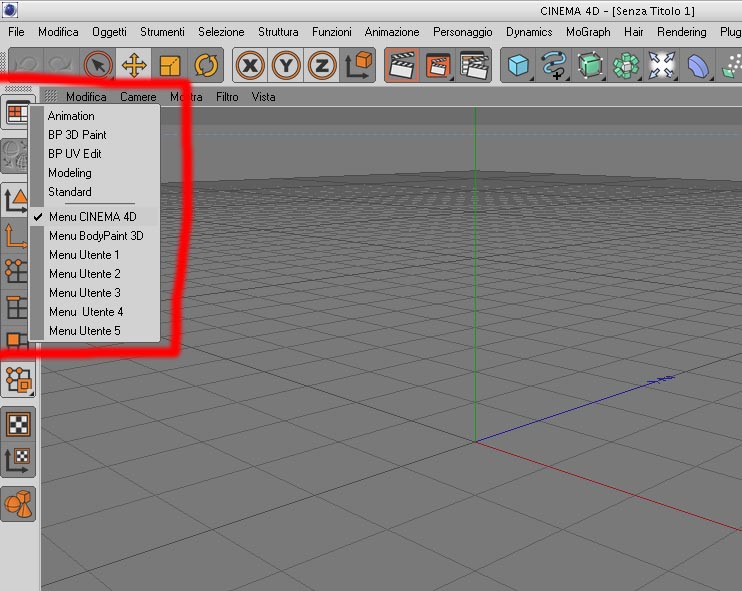 devi andare nel bottone dei layout a sinistra e impostare il menu di cinema4D :):):):)