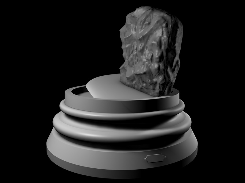 Il piedistallo è una spline in rotazionenurbs, il resto è modellazione poligonale, fatta eccezione per la parete rocciosa che è scolpita in Z.