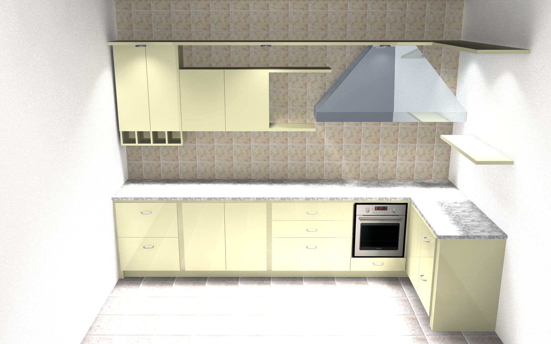 Ciao, immagino che questa cucina abbia una finestra ?! se si, ti consiglio di posizionare una bella luce infinita fuori per simulare la luce del sole.