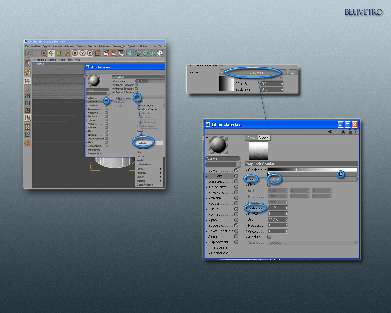 Ho usato soprattutto lo shader Disturbo, nella sua variante Luka (che personalmente amo molto), e lo shader Gradiente.