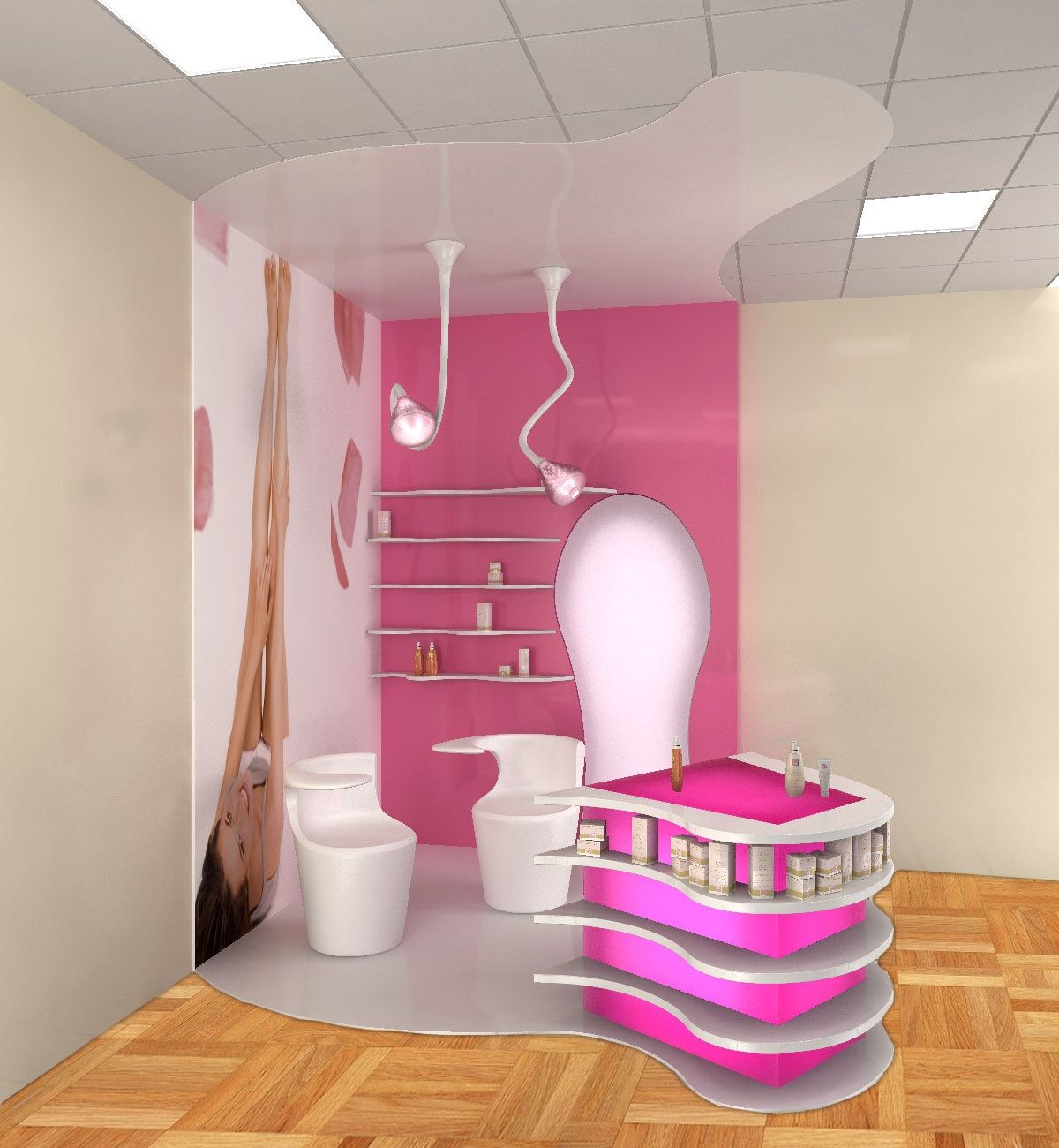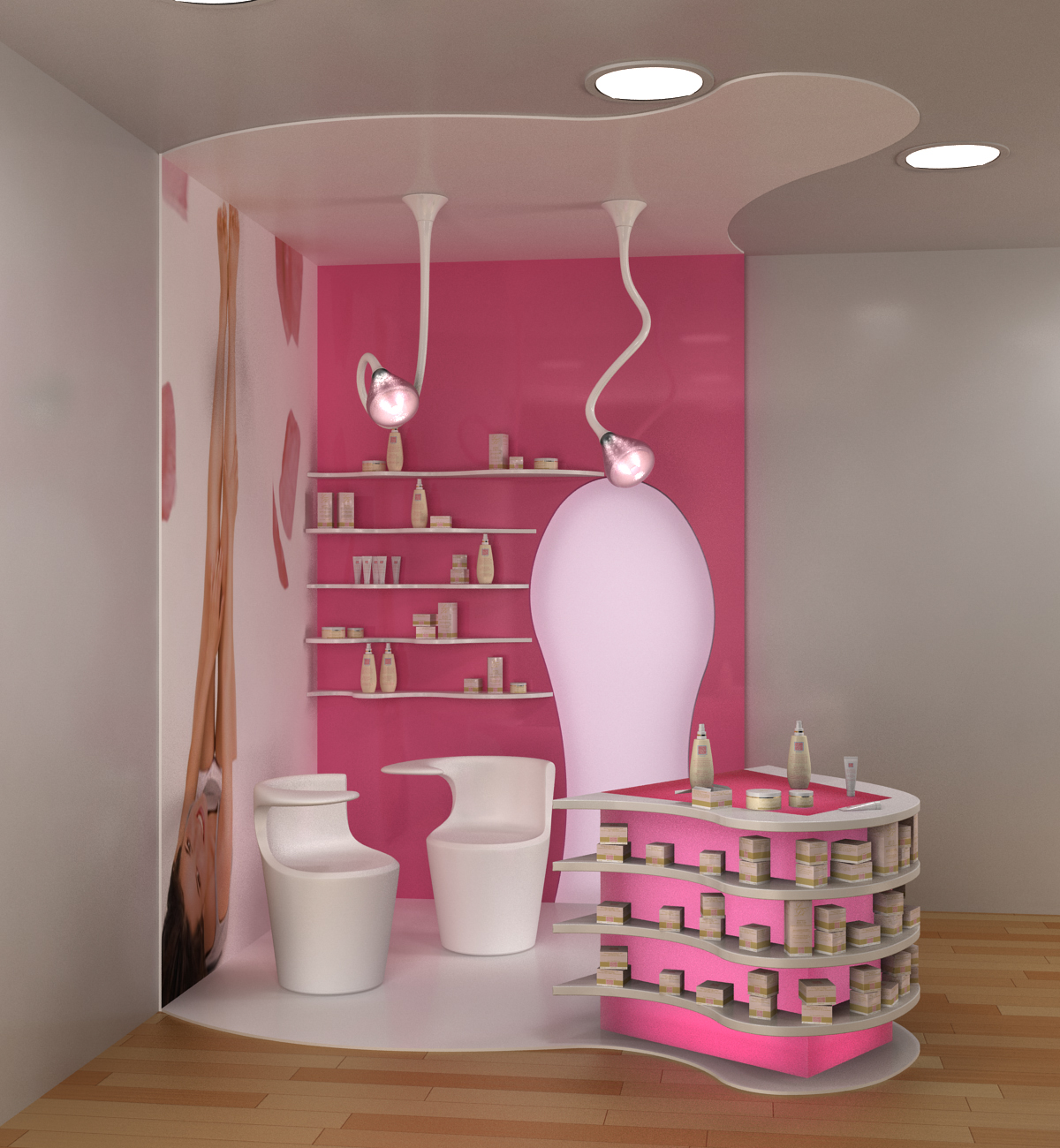per un lavoro devo fare delle immagini di un corner espositivo all'interno di una farmacia, ho settato luci e materiali in vray ma ancora non mi convince moltissimo...mi farebbe piacere se poteste darmi dei consigli su come migliorare!!!!