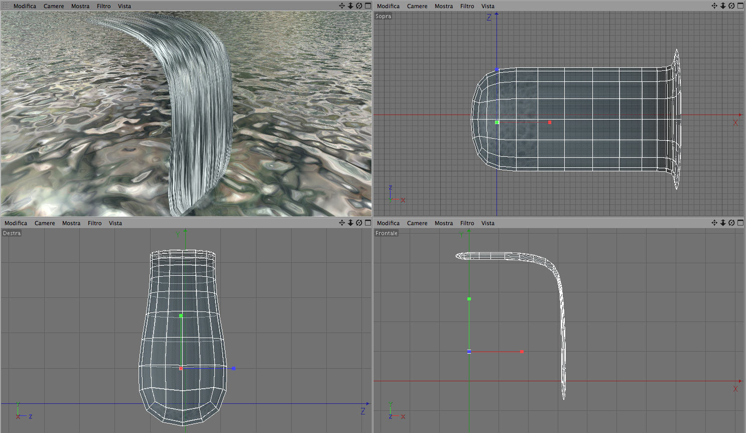 Basta che importi la tua mesh come oggetto nel programma e poi alla sommità di questa scala ci piazzi un emettitore di particelle e crei l'acqua. Ci aggiungi una gravità, controlli che tutto funzioni (ci sono varo parametri) e poi reimporti tutta la scena in cinema...