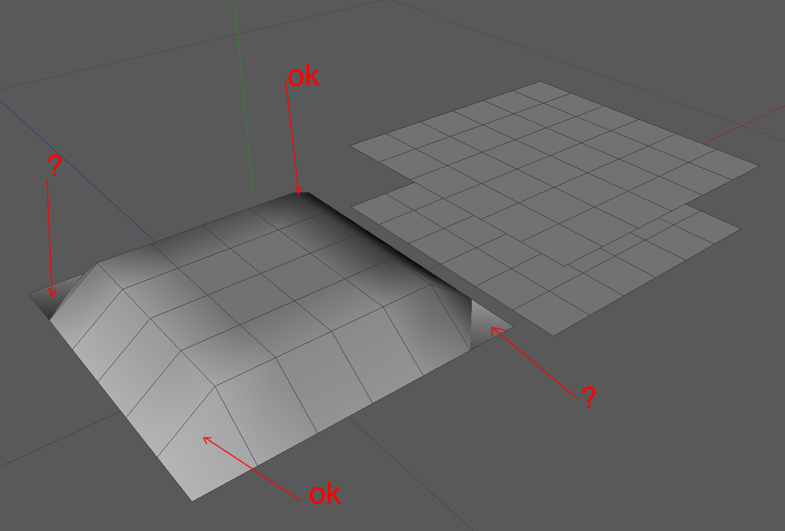 Dunque credo che dipenda dal fatto che nel momento in cui fai una "forzatura" su un poligono quadrangolare spostando i punti in modo da renderlo "non planare", il software internamente suddivida il poligono in 2 triangoli... quello che crea il tuo problema, è la direzione del taglio. Se guardi l'immagine allegata forse capisci meglio cosa intendo. Ho segnato in rosso la direzione del taglio dei due poligoni in questione per farti capire cosa succede quando li distorci.