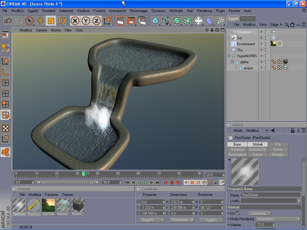 Ho usato anche pyrocluster per l'effetto "caduta acqua". Ricorda che nella grafica si può arrivare ad uno stesso risultato percorrendo diverse strade, a seconda delle tue conoscenze, dei tuoi programmi, e del tuo...hardware