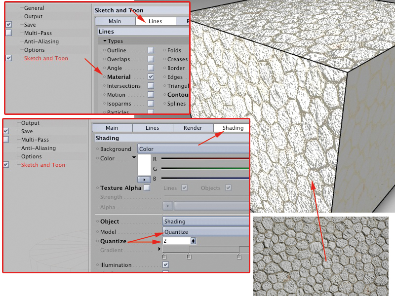 mmm.. nei render settings di sketch&toon puoi spuntare, nella sezione Lines, la voce "material", che associato al modo di render "shading" (pannello Shading) permette di "sketchare" anche le textures...però non puoi cmq scegliere un tratto con il quale tracciarle, puoi semplicemente impostare di quanti step è composto il disegno (come se fosse il filtro posterizza di photoshop). Dipende un pò da cosa vuoi ottenere di preciso...forse converrebbe in ogni caso trattare la texture in photoshop con qualche filtro.