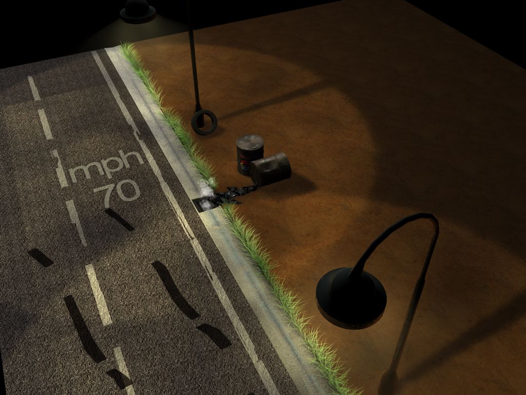 immagino così la vecchia 66 americana, tipo nel texas... la prossima cosa che voglio fare è "rovinare" un po la sgommata e l'asfalto vicino la cunetta"... magari inserire qualche cartaccia che svolazza....