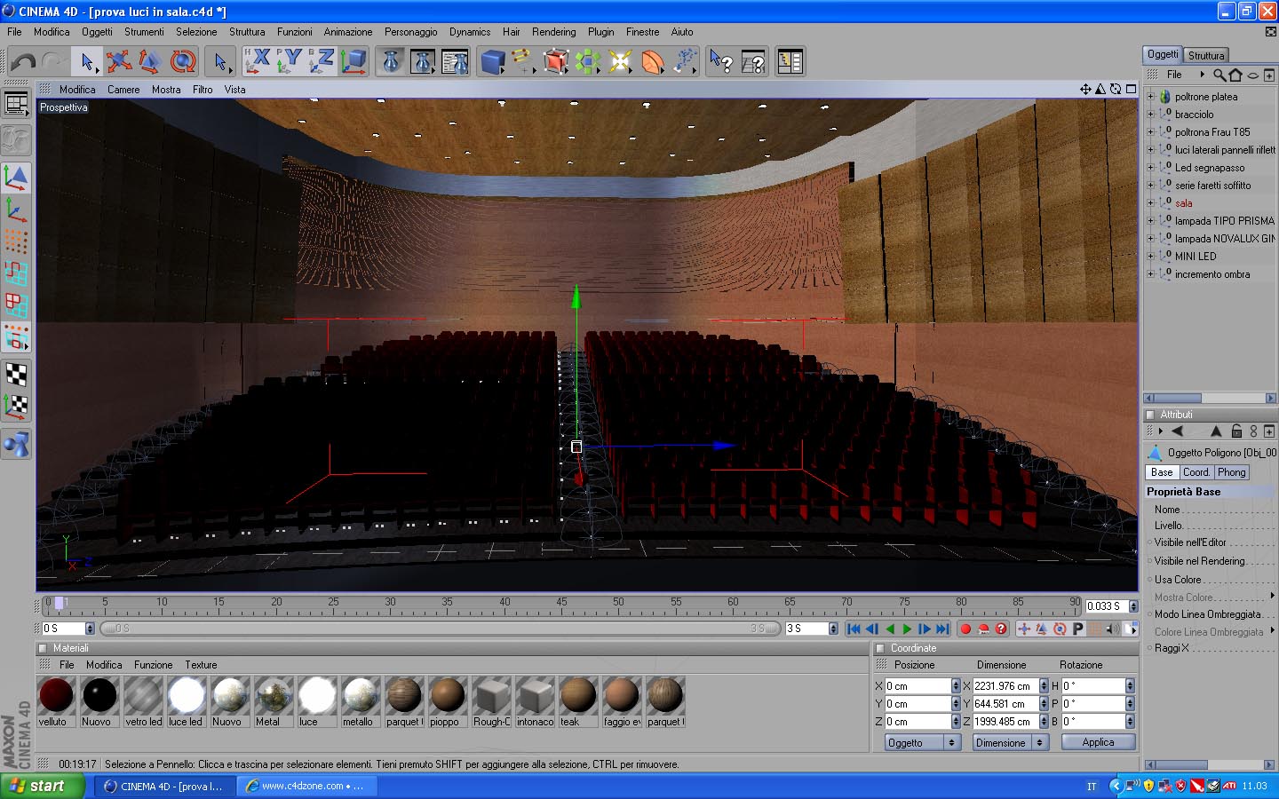 Adesso ci sono a stento riuscito a fare i render, ma separatamente ( poltrone e sala con luci e materiali). Il risultato è quello nelle immagini. Spero vivamente che qualcuno potrà darmi una mano. Grazie
