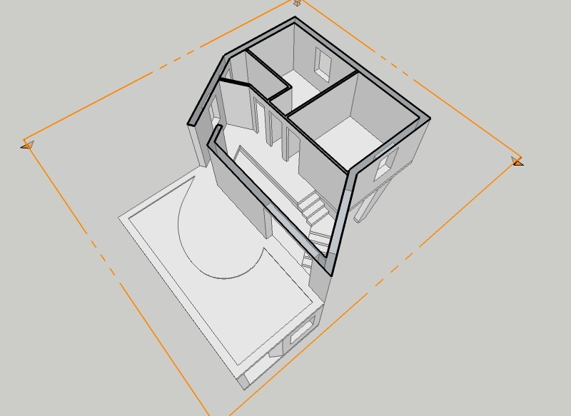 Non è molto grande; sotto ho previsto un unico ambiente che farà da soggiorno/cucina ed un bagno; sopra due camere da letto e un bagnetto per la notte con doccia!