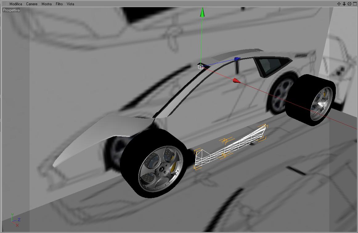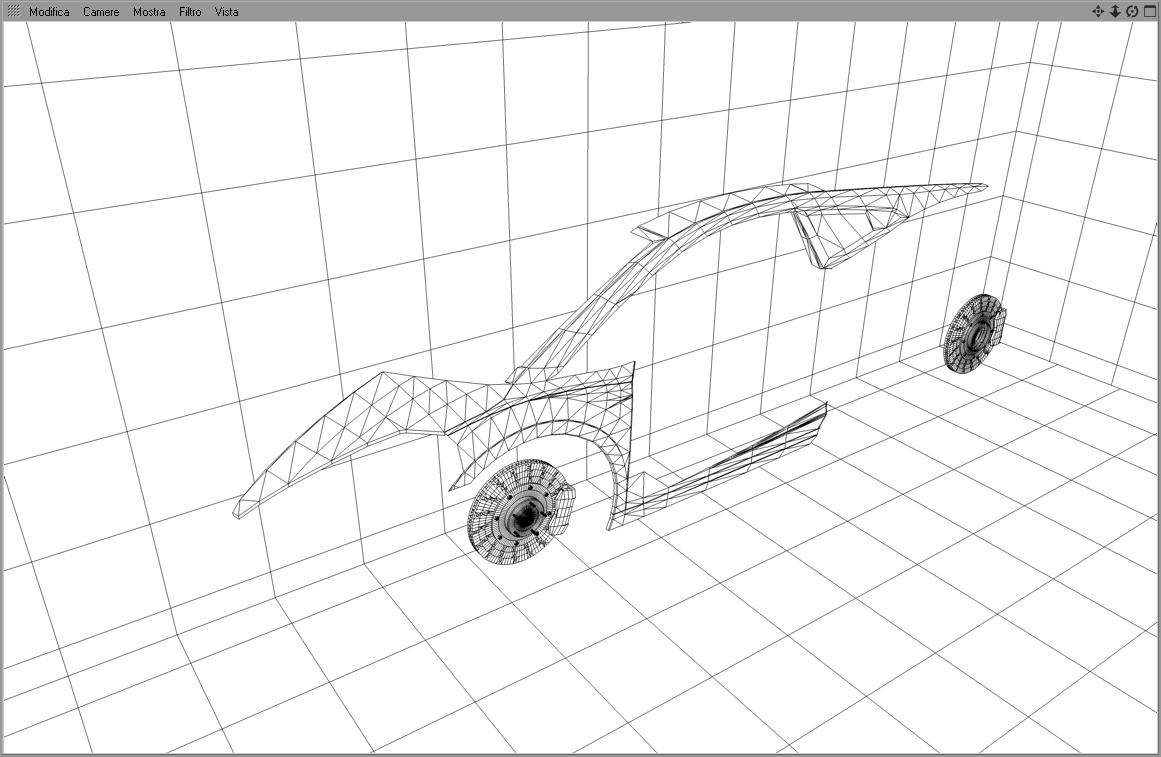 Ma visto che le cose semplici non mi piacciono per la modellazione ho evitato di utilizzare l'hipernurbs e a suon di piani e phong con il point to point e varie triangolazioni ha preso forma la macchina. Le hipernurbs le ho evitate per via dei vari tagli e sezionature che ho apportato alla carrozzeria. comunque il modello per quanto sia spigoloso in alcune parti e' quanto mi bastava per fare il TEST