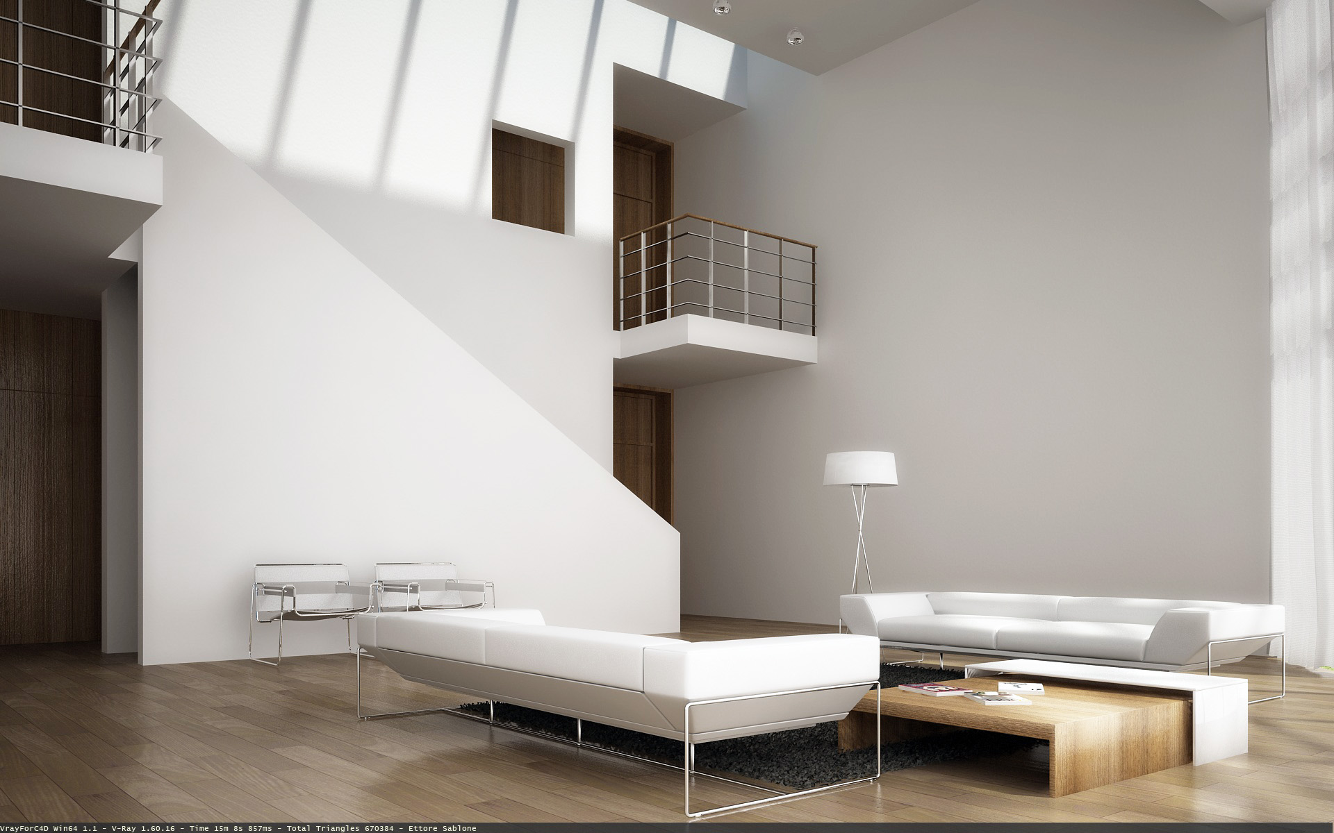 mi piace bella,diminuirei leggermente l'intensità della luce per darle + profondità,per il tappeto metti un pelosone alto,o una zebra,abbassa ancora i bump del legno rendilo meno riflettente aumenta leggermente il glossy. 8-)