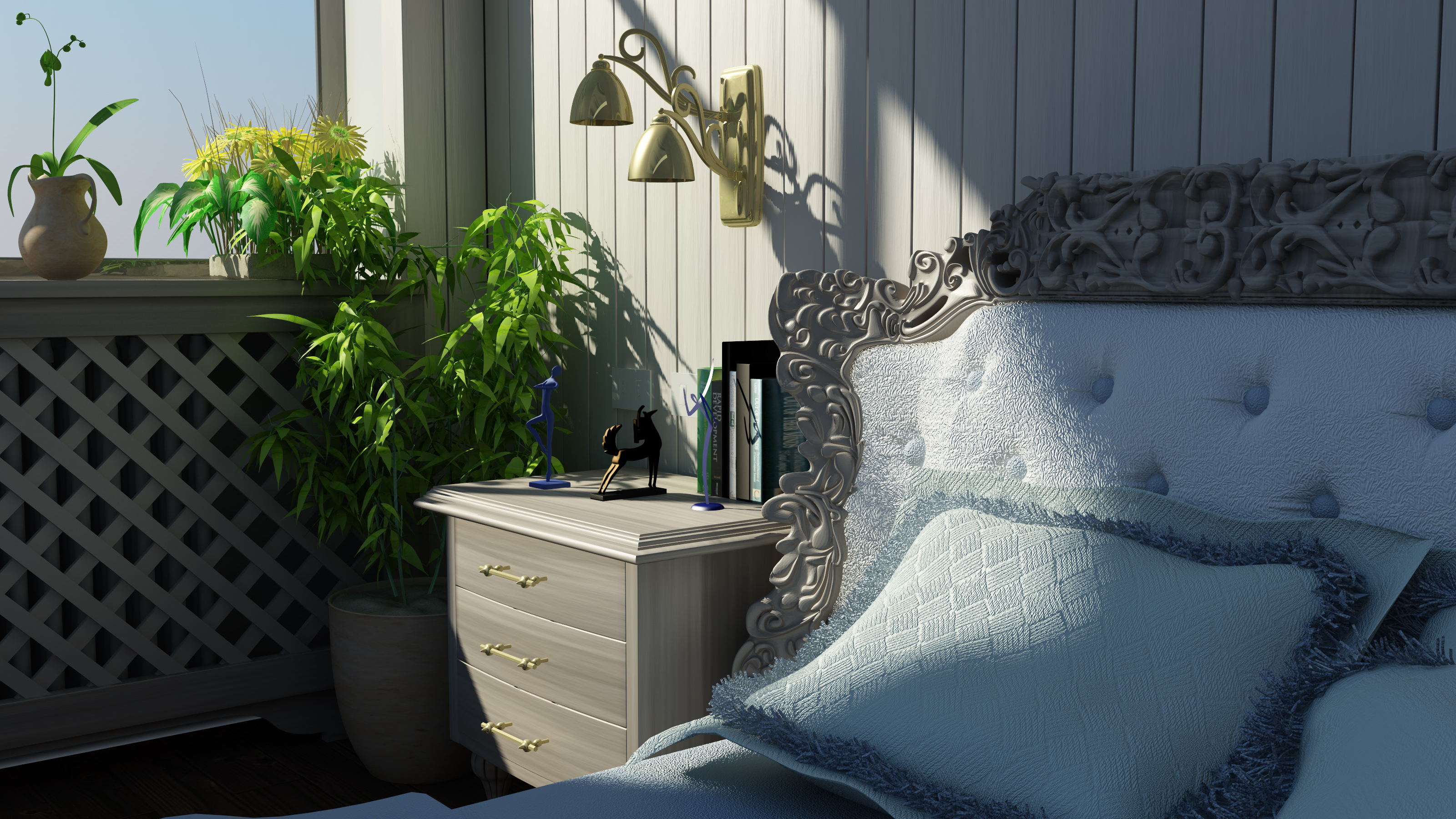 X il resto dato l'alto dettaglio del letto, sia appunto per la modellazione che x il texturing avrei dato più occhio anche al resto, tipo la copertina del libro, e le texture delle piante e le foglie un po' troppo squadrate della pianta sul davanzale...ma sono str....ate giusto perchè hai tirato fuori un render enorme...