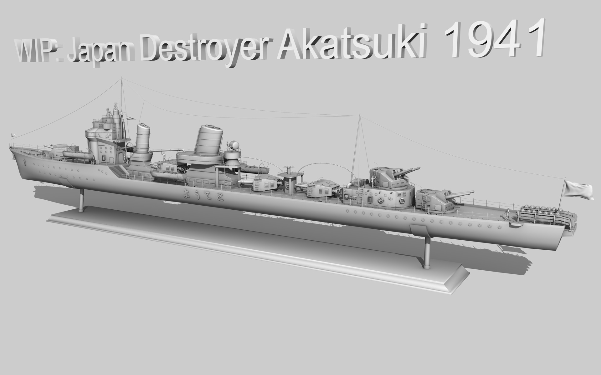 Dunque, il Cacciatorpediniere Akatsuki è una nave della seconda guerra mondiale, presente nei mari dal 1941. A causa della mancanza di buone immagini di riferimento diciamo che non si tratta di una ricostruzione fedele al 100%. Al 65% trattasi dell'Akatsuki nelle sue componenti principali (scafo, cannoni, torrette, struttura generale...), per il 5% ci sono elementi dell'Amajirii/Fubuki, destroyers della stessa classe ed anni (targhe e transenne), per il restante 30% c'è un lavoro di "concept" da parte mia nei particolari della nave che sono comunque presi ad "immagine e somiglianza" da altre navi similari dello stesso periodo (fari, faretti, radar, estintori, salvagenti, catenaggio, etc...).