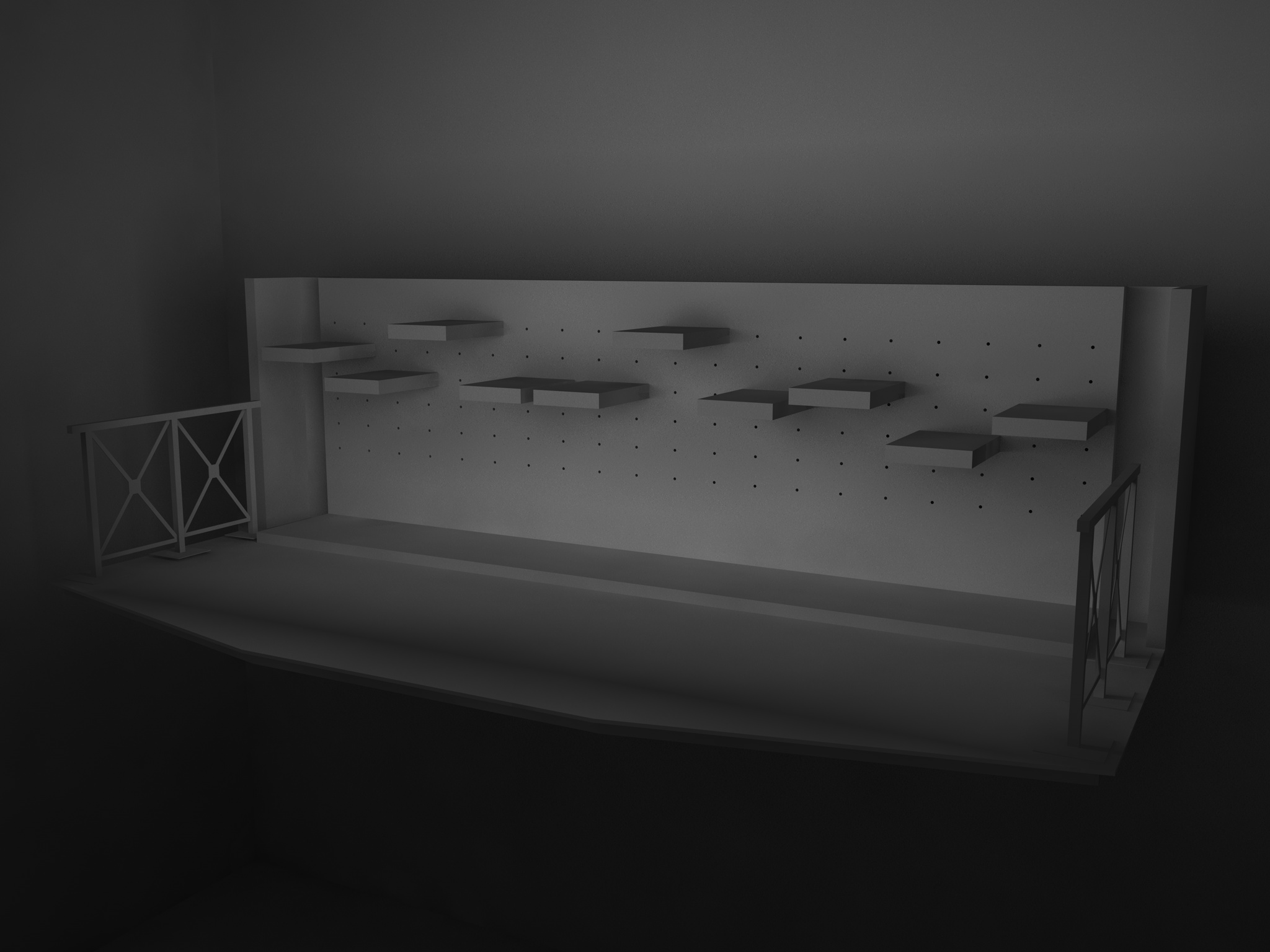 fai una parete dove appoggi il tuo mobile ed un pavimento, crea un oggetto cielo inserisci una luce con target, di tipo area con ombre are, per illuminare lateralmente il tuo mobile