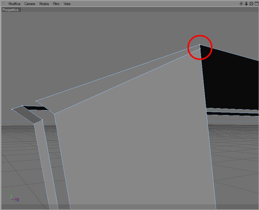 Con il coltello fai un taglio in modo da creare un punto sotto al primo; con Funzioni > Sciogli unisci le due facce che si creano a formarne una sola ed ottenere la situazione in figura; quindi estrudi settando come Angolo Massimo 146°.