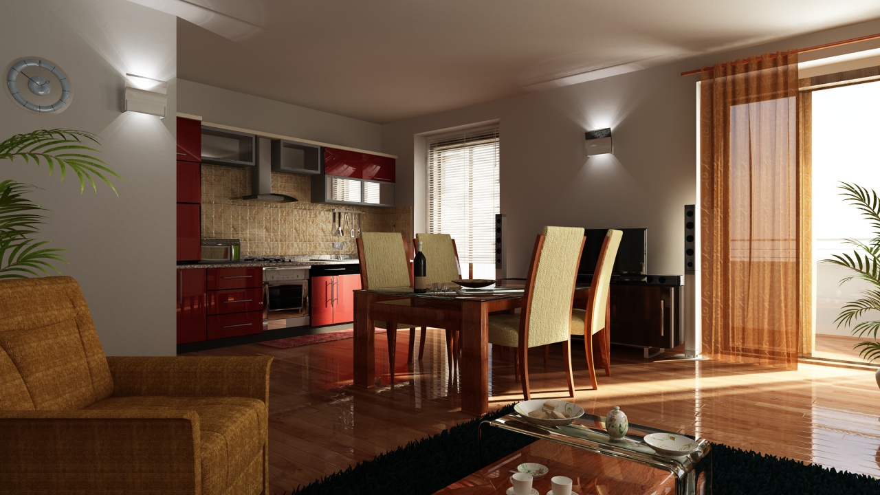 grazie a tutti per i consigli!! ho tolto il tag phong del tavolino, ma l'ho voluto lasciare sulle casse... ho sistemato il bump delle mattonelle invertendo i valori da 0 a 1e ho cambiato il tappetto usando displacement... non capisco i riflessi a chiazze che fa sullo sportello della cucina vicino alla finestra.. però alla fine son piccolezze che nemme no si notano tanto.. poi per il tappeto della cucina ho provato a farlo poggiare bene a terra ma niente.. é un parallelepipedo e non un piano, quindi si fonde con il pavimento però nulla.. sembra che voli.. magari sarà l'effetto del displacement che lo fa vedere cosi..