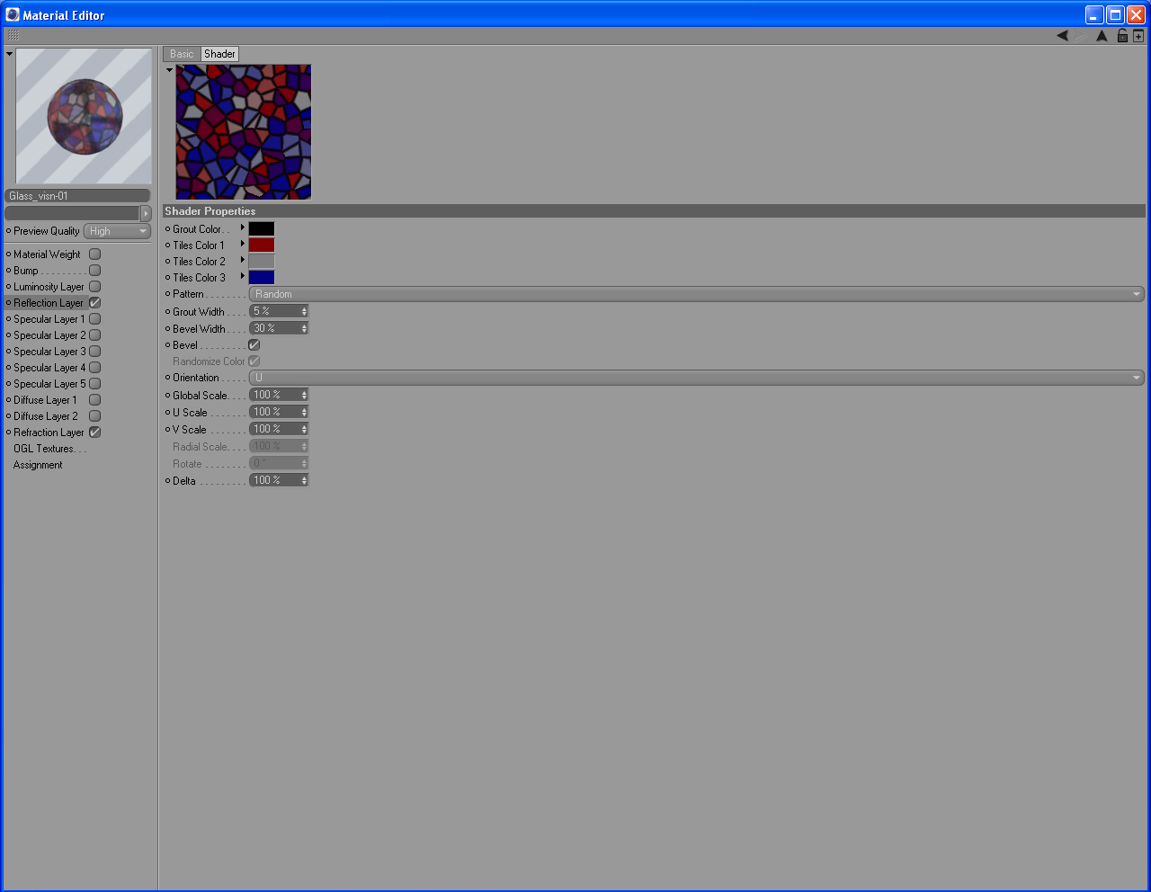 beh,come l hai impostato tu nn va bene...devi attivare il canale refraction e dare volume fog.come colore metti un bianco e imposti il valore IOR con una cifra che va da 1.5 a 1.9,ma consiglierei di lasciare 1.6 che va piu che bene...attivi il primo specular layer e in basso togli la spunta da trace reflections.poi attivi il secondo specular layer e togli la spunta a trace specular e attivi il fresnel IOR che sta in basso e al bianco gli dai una gamma sul grigio...poi la texture la puoi caricare sia nel secondo livello di specular che nel colore rifrazione che trovi nel refraction,il primo canale che hai attivato..poi dagli anche un rilievo caricando la stessa texture,ma con un filtro desaturandola,cosi te la da in scala di grigi e x il rilievo va meglio...prova così