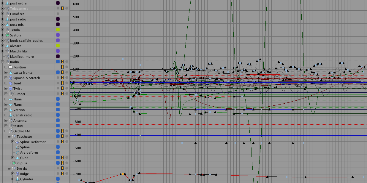 macroemina ha scritto: Ho inserito la traccia audio nella timeline per vedere dove sono i picchi e spostare di conseguenza i keyframes. Però ho un'infinità di curve e non riesco a capire a che oggetto appartengano; si accavallano, non sono in corrispondenza dell'elemento a cui si riferiscono... insomma un disastro.